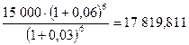 Р = 5000* [ 1-(1+0,03)-15]/0,03 + 100000 (1+0,03)-15 = 5000 *(1-1/1,5580)/0,03 + 100000(1/1,0315) = 5000 * 11,9384 + 100000*0,64185 = 123877 руб.