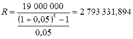 Решение: i = 5% = 0,05 n = 6 лет FVA = 19 000 000 руб.