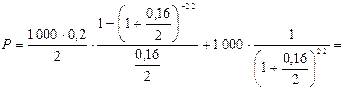 40. Двухлетняя облигация номиналом 1 000 руб. имеет 4 Полугодовых купона доходностью 20% годовых каждый. Рассчитать цену её первоначального размещения, приняв ставку сравнения 16%.